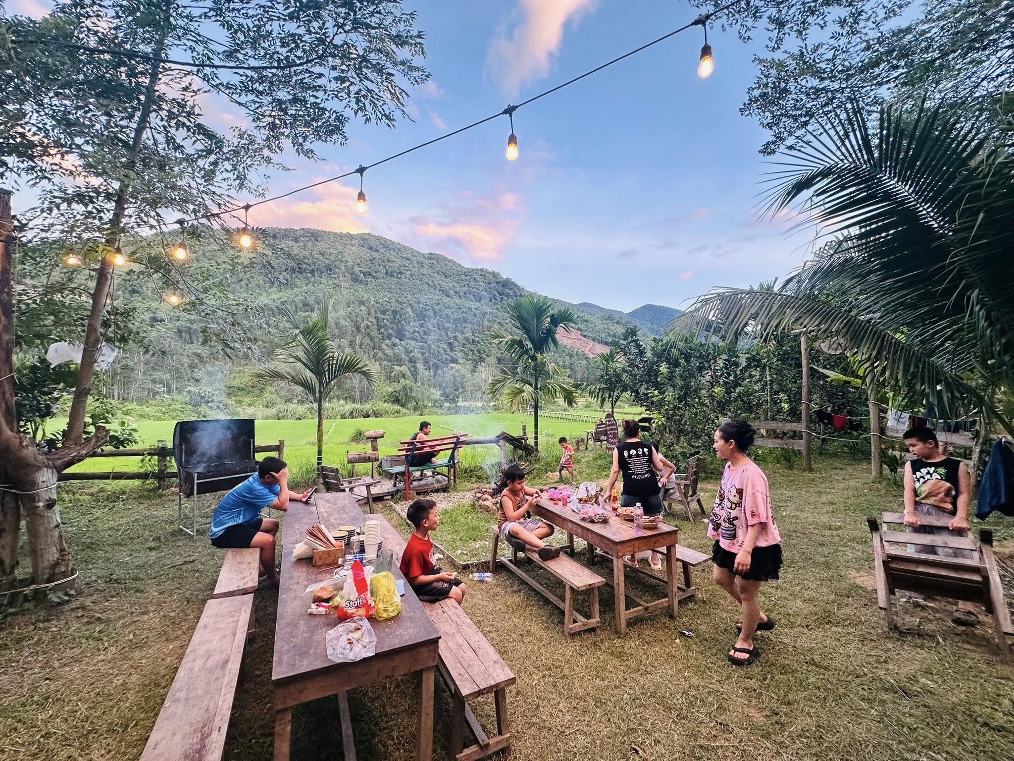 + Buổi tối, du khách có thể quây quần bên đống lửa hồng nướng thịt, khoai, trò chuyện cùng gia đình, bạn bè, hoặc đơn giản là ngắm sao và ngâm chân bằng nước thảo mộc trước khi say giấc trong căn nhà sàn ấm áp.