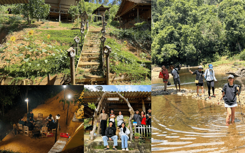 – Nằm bên sườn đồi dành cho những ai yêu sự mộc mạc, muốn hòa mình vào thiên nhiên. Tại đây, bạn sẽ ngủ trong các bungalow gỗ tái chế, tắm suối, săn mây, đi bộ khám phá làng của người Bana, chụp ảnh giữa rừng già hoặc đơn giản là… không làm gì, chỉ tận hưởng sự tĩnh lặng.