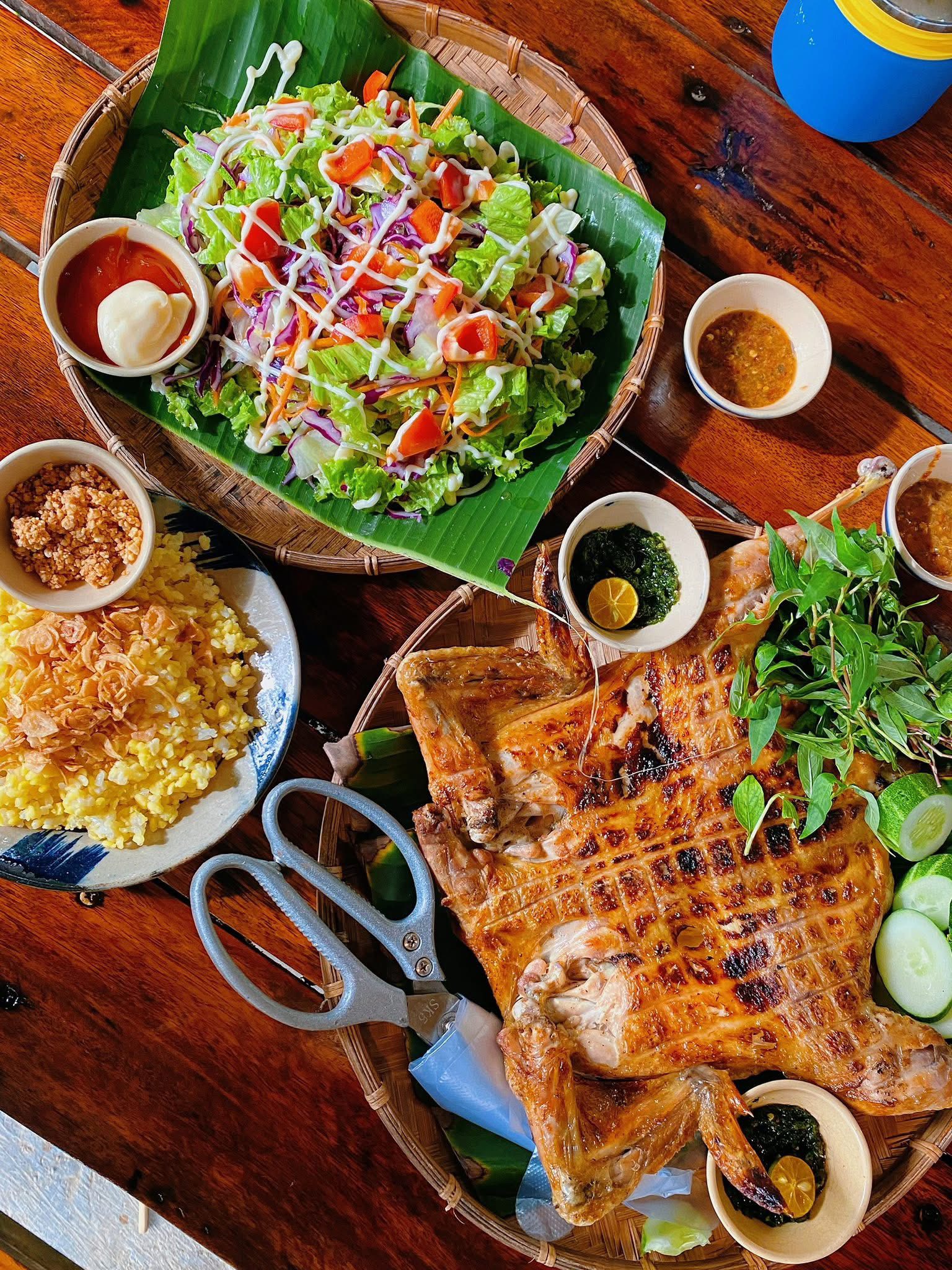 – Quán sở hữu không gian rộng rãi, thoáng đãng với hồ sen và cây keo trổ bông quanh năm, mang đến cảm giác thư thái. Món gà nướng tại đây được đánh giá cao về độ thơm ngon, mềm mại và đậm đà.