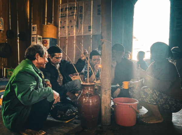 - Du khách nếm thử rượu cần của người Ba Na bản địa