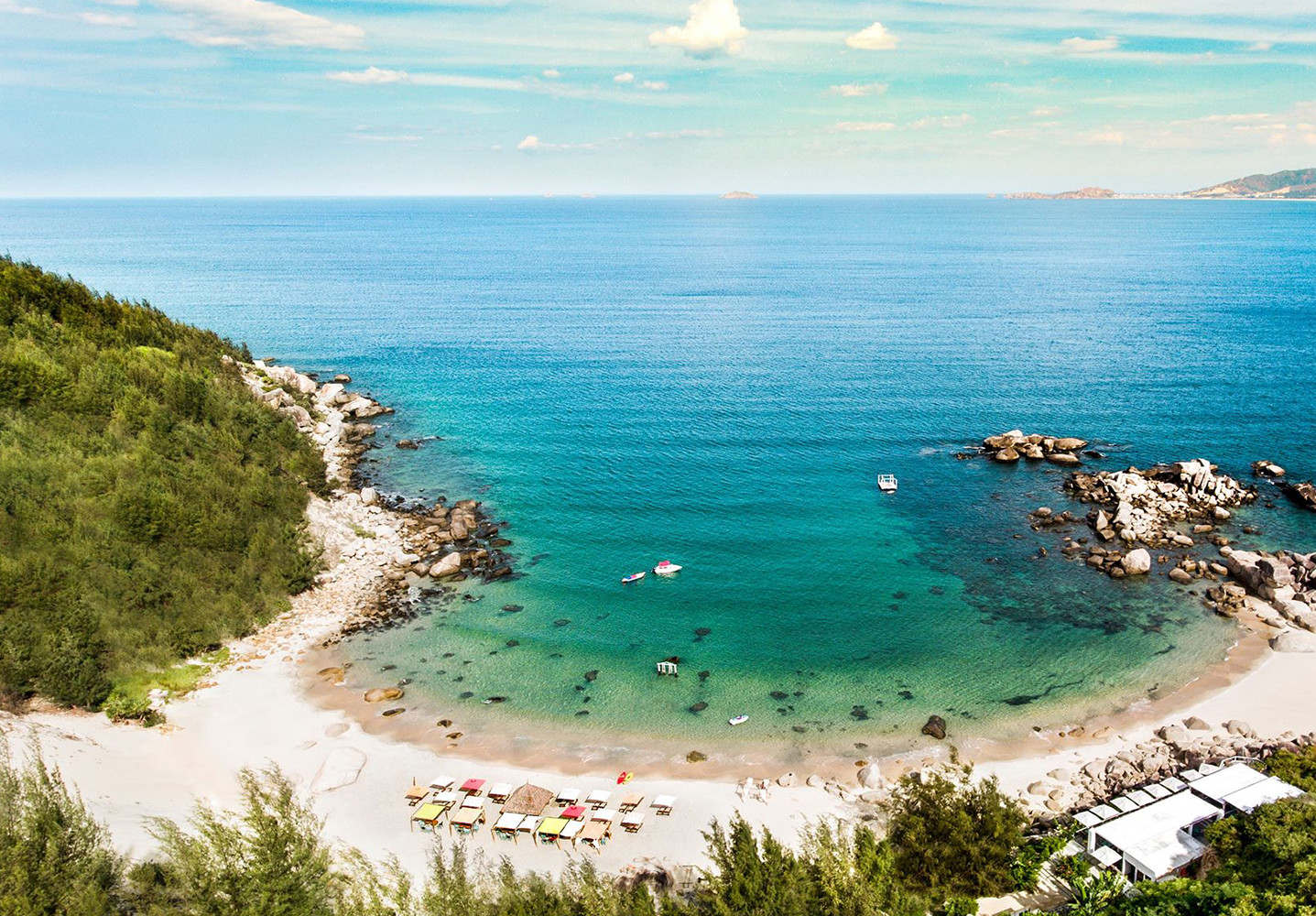 Cát trắng, nước xanh ngọc, và đặc biệt là các gành đá với nhiều hình thù lạ mắt và kỳ thú, tạo thành khung cảnh vừa hoang sơ vừa thơ mộng.
